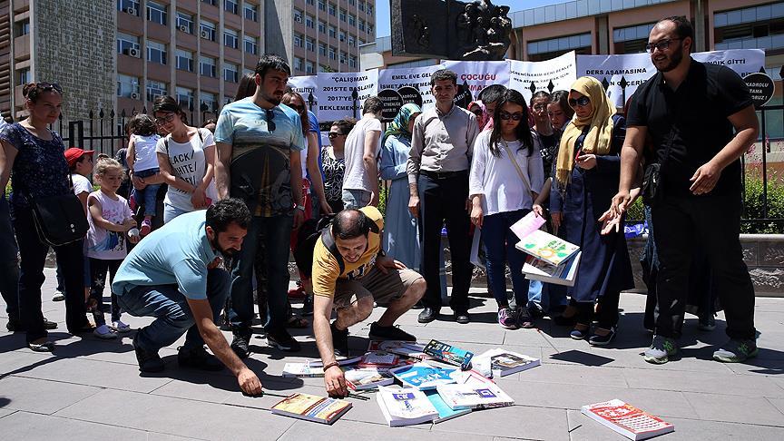 Atanamayan öğretmen adayları, ağustos ayında öğretmen ataması yapılmaması kararını protesto etmek için Milli Eğitim Bakanlığı (MEB) önüne KPSS test kitaplarını ve kalemlerini bıraktı.
