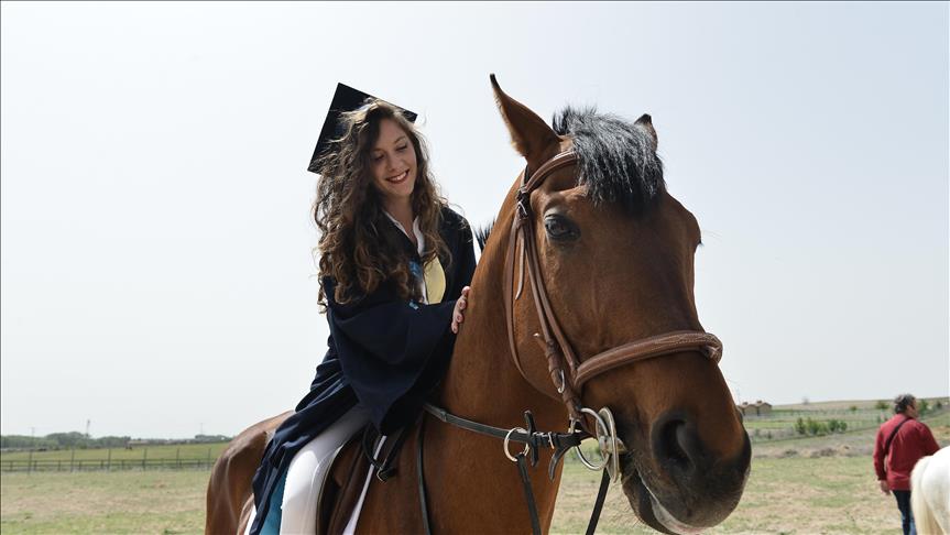 Eskişehir Osmangazi Üniversitesi (ESOGÜ) Mahmudiye Atçılık Meslek Yüksekokulundan mezun olan 27 öğrenci, diplomalarını at üstünde aldı.