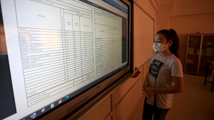 Eğitim öğretime devam eden öğrenciler okullarında akıllı tahtalardan karnelerini inceledi. Öğrenciler, heyecanla bir birlerinin ders notlarına baktı.