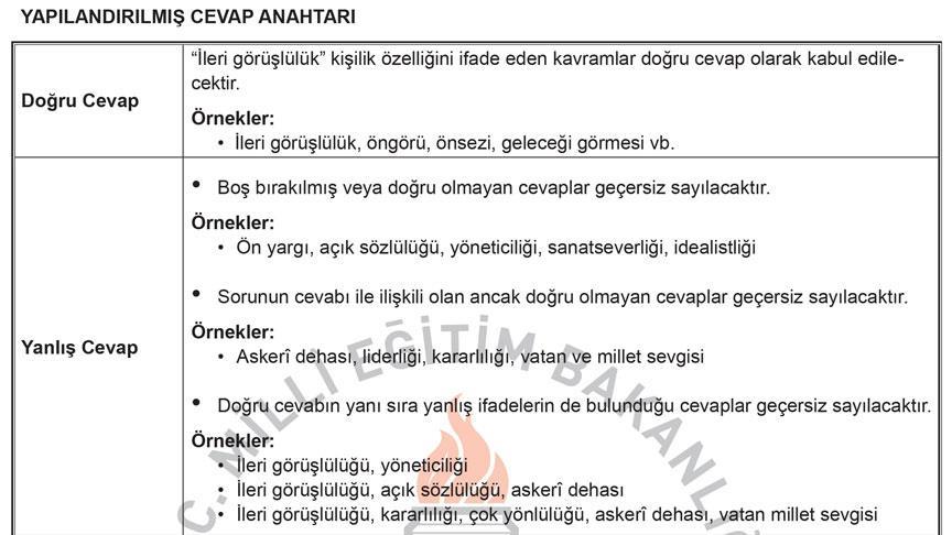 Bakanlık tarafından, öğrenciler, velileri ve tüm kamuoyunu bilgilendirmek amacıyla bugün içinde bakanlığın internet sitesinden açık uçlu sorular ve yapılandırılmış cevap anahtarlarının örnekleri de yayımlanacak.