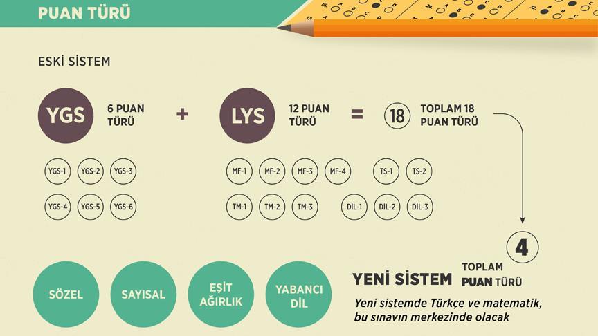 Buna göre, YGS-1, YGS-2, YGS-3, YGS-4, YGS-5 ve YGS-6 olmak üzere 6 puan türü ile LYS'lerdeki MF-1, MF-2, MF-3, MF-4, TM-1, TM-2, TM-3, TS-1, TS-2, DİL-1, DİL-2, DİL-3 olmak üzere 2 puan türü sadeleştirilecek.