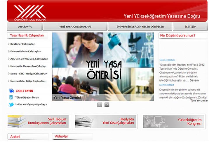 Yeni yasa tasarısı önerisine ilişkin ilgili paydaşların görüşlerini çalıştaylar, internet üzerinden açılan forum sayfası ve sosyal medya üzerinden almaya devam eden YÖK, tasarı taslağında eleştiri konusu olan ''devlet üniversitelerinde rektör seçimleri için izlenecek yol''un belirlenmesi için de konuyu ''yeniyasa.yok.gov.tr adresi üzerinden yayınlanan anketle tartışmaya açtı.