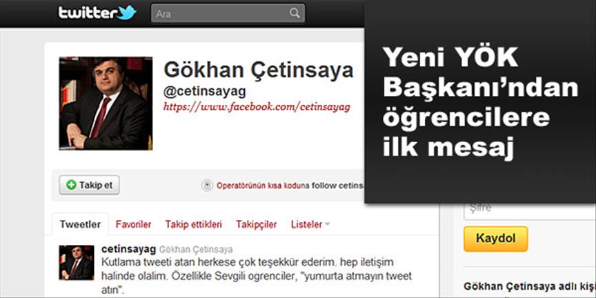 YÖK Başkanlığı'na atanmasından dolayı kutlama mesajı atanlara twitter'dan teşekkür eden Çetinsaya, "Hep iletişim halinde olalım" dedi.