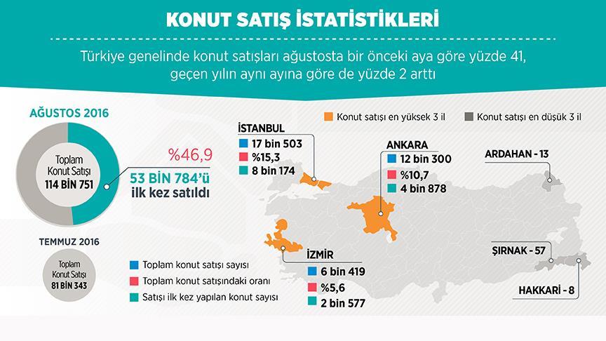 Buna göre, ülke genelinde ağustosta satılan konut sayısı, bir önceki aya göre yüzde 41, geçen yılın aynı ayına göre de yüzde 2 artarak 114 bin 751 oldu.