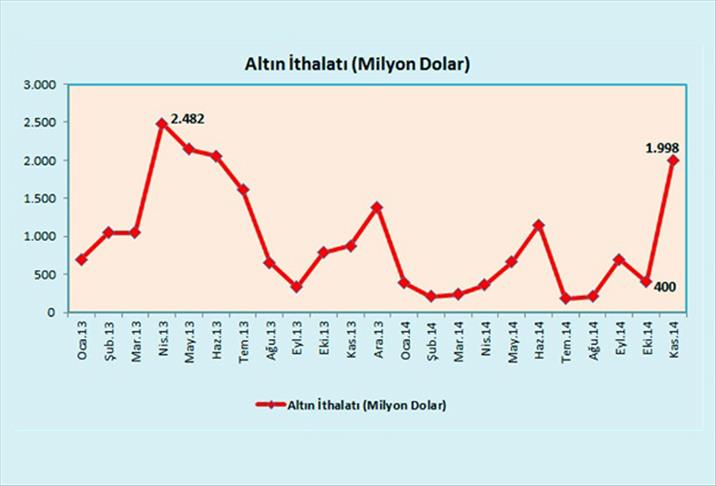 Borsa İstanbul Kıymetli Madenler ve Kıymetli Taşlar Piyasası'nın 2014 kasım ayı verilerinde altın ithalatı 2013 yılının aynı ayına göre yüzde 143,4 artarak 19,3 tondan 46,9 tona yükseldiği görülmüştü. Türkiye'nin altın ithalatı kasım ayında bir önceki aya göre ise yüzde 609,7 arttı. Ekim ayında altın ithalatı 6,6 ton düzeyindeydi.