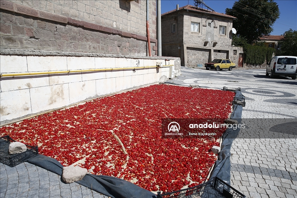 Kayseri'de bir mahallede yetiştirilen tescilli Cırgalan biberi, kadınlar tarafından ayıklanıp parçalara ayrıldıktan sonra çatılar, sokak araları ve mahalle meydanında kurutulmaya bırakılıyor.