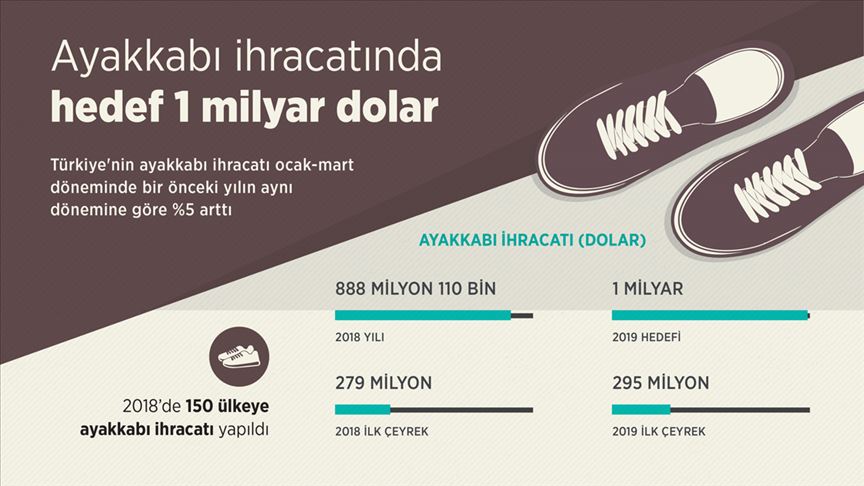 Ayakkabı ihracatı bu yılın ocak-mart döneminde, geçen yılın aynı dönemine göre yüzde 5 artarak 295 milyon dolara çıktı. Ayakkabı ihracatında ilk sırayı yaklaşık 40 milyon dolarla Rusya alırken bu ülkeyi 20,1 milyon dolarla Irak, 17,9 milyon dolarla Almanya izledi.