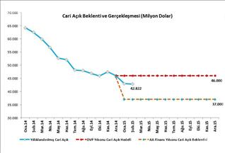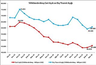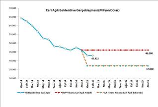 "Geçen yıl ilk 7 ayda 26,9 milyar dolar olan cari işlemler açığı bu yılın ilk 7 ayında 25,4 milyar dolara geriledi. Cari açığımız geçen yılın aynı dönemine göre 1,5 milyar dolar azaldı. Bu, ülke ekonomimiz için oldukça olumlu bir gelişme. Cari açıktaki bu olumlu gelişmenin altında büyük ölçüde ilk 7 ayda görülen dış ticaret açığındaki düşüş yatıyor. 2014 yılının ilk 7 ayında 34 milyar 183 milyon dolar açık veren dış ticaret dengesi bu yılın aynı döneminde 30 milyar 754 milyon dolar açık verdi."
