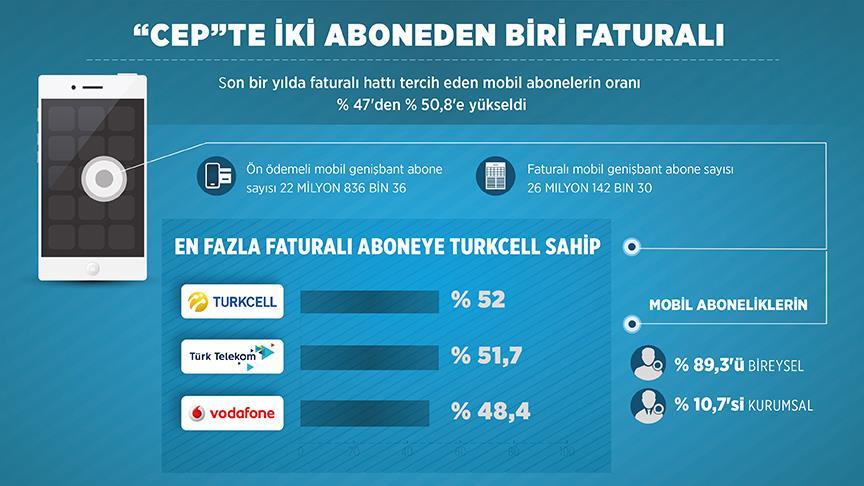 Buna karşılık, oransal olarak en fazla faturalı aboneye sahip GSM şirketi Turkcell. Turkcell abonelerinin yüzde 52'si, Türk Telekom abonelerinin yüzde 51,7'si, Vodafone abonelerinin ise yüzde 48,4'ü faturalı hat kullanıyor.