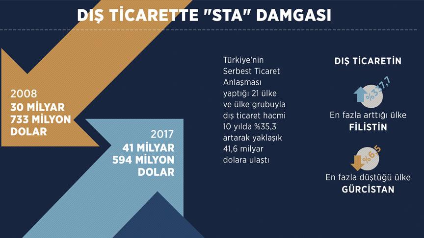Türkiye'nin STA yaptığı 21 ülke ve ülke grubuyla arasındaki toplam dış ticaret hacmi, 10 yılda yaklaşık yüzde 35,3 artarak geçen yıl 41 milyar 594 milyon 103 bin 229 dolara yükseldi. Türkiye'nin STA imzaladığı ülkelerle ticaretinin toplam ticaretteki payı geçen yıl yüzde 10,6 olarak hesaplandı.