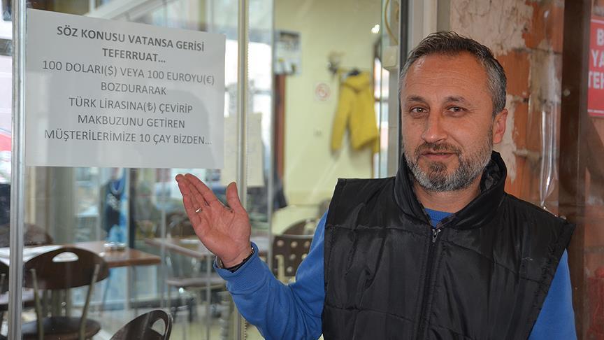 "Küçük esnaf olarak kendimizce böyle bir kampanyayı uygun gördük ve 100 dolarını veya avrosunu bozdurup makbuzunu getirene 10 bardak çayı bedava veriyoruz. Kampanyamızın diğer esnafımıza ve iş adamlarına örnek olması için önayak olduk. İnşallah bu kampanya artarak devam eder ve Türk liramız değer kazanır. Kampanyamızın duyan bir müşterimiz 2 bin 300 avrosunu bozdurarak makbuzunu bize getirdi. Biz de bu müşterimize çay, simit, börek ikramında bulunduk. Müşterimiz hakkı olan çayları diğer müşterilerimize ikram ederek kampanyamıza destek oldu. Bu da bizi oldukça memnun etti."