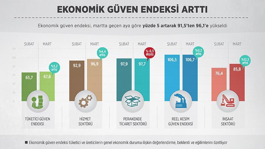Buna göre, ekonomik güven endeksi martta geçen aya göre yüzde 5 artışla 91,5 değerinden 96,1'e yükseldi. Ekonomik güven endeksindeki artış, inşaat sektörü, hizmet sektörü, tüketici ve reel kesim (imalat sanayi) güven endekslerindeki artışlardan kaynaklandı.