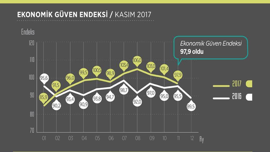 Kasım ayında tüketici güven endeksi 65,2, reel kesim güven endeksi 109,8, hizmet sektörü güven endeksi 99,7, perakende ticaret sektörü güven endeksi 99,9 ve inşaat sektörü güven endeksi 82,4 değerine geriledi.
