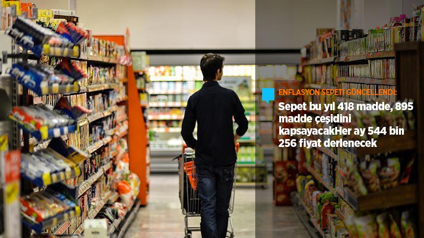 TÜİK, enflasyon sepeti bu yıl, 418 madde, 895 madde çeşidini kapsayacak. Sepette 28 bin 711 iş yeri ve 4 bin 274 konuttan her ay 544 bin 256 fiyat derlenecek.