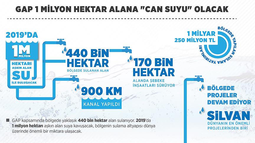 "Sulamada şu anda 440 bin hektara yaklaştık. 1 milyon hektarın ise altyapısına yönelik ciddi çalışmalar yapıldı. Bölge genelinde 900 kilometreyi aşkın ana kanalın yanı sıra su toplama alanları ve ana depolar yapıldı. Şu anda 170 bin hektar alanda ise şebeke inşaatları sürüyor. İnşallah 2019 gibi 1 milyon hektar alanı sulamada aşarak bölgenin sulama altyapısını dünya üzerinde önemli bir miktara ulaştırmış olacağız. Bu sulamalarla bölgenin dünyada önemli bir sulama ve gıda üssü hayalini gerçekleştirmiş olacağız" diye konuştu.