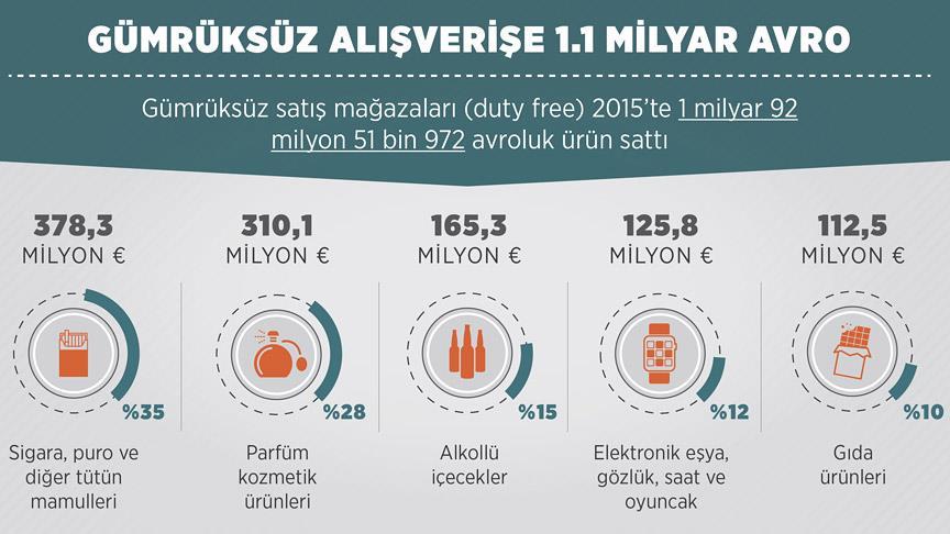 Böylece gümrüksüz satış mağazalarında yapılan toplam harcama 1 milyar 92 milyon 51 bin 972 avroya ulaştı. Bu rakam 2014 yılında 1 milyar 50 milyon 18 bin 727 avro olarak gerçekleşmişti.