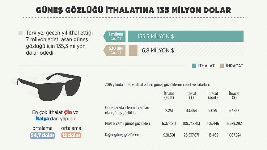 Türkiye, geçen yıl ithal ettiği 7 milyon 8 bin 765 güneş gözlüğü için 135 milyon 323 bin 748 dolar ödedi.