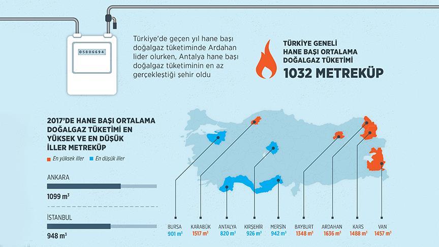 Hane başı gaz tüketiminin en yüksek olduğu iller arasında Karabük bin 517 metreküple ikinci, Kars bin 488 metreküple üçüncü, Van bin 457 metreküple dördüncü ve Bayburt bin 348 metreküple beşinci sırada yer aldı.
