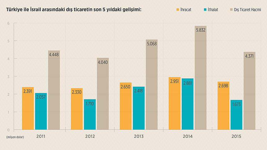 Türkiye-İsrail ilişkilerinin normalleşmesine yönelik mutabakata varılmasının, iki ülke arasındaki dış ticarete olumlu etki etmesi bekleniyor. Son 5 yılda ihracat yüzde 13 artışla 2,7 milyar dolara yükselirken, ithalat yüzde 19 azalışla 1,7 milyar dolara geriledi. İki ülke arasında dış ticaret geçen yıl 4,4 milyar dolar oldu.