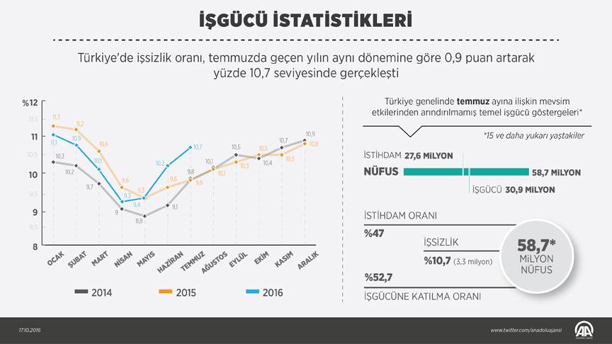 İş gücü, temmuzda 2015'in aynı dönemine göre 650 bin kişi artarak 30 milyon 961 bin kişi, iş gücüne katılma oranı ise 0,3 puan artarak yüzde 52,7 oldu. Söz konusu dönemde erkeklerde iş gücüne katılma oranı değişim göstermeyerek yüzde 72,8, kadınlarda ise 0,6 puanlık artışla yüzde 33 olarak gerçekleşti.