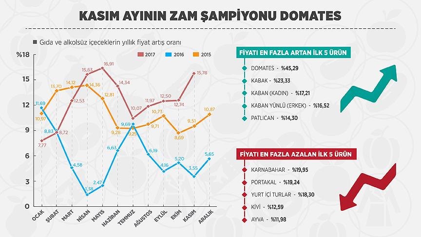 Tüketici fiyatları bazında kasımda en yüksek fiyat artışı, yüzde 45,29 ile domateste görüldü.
