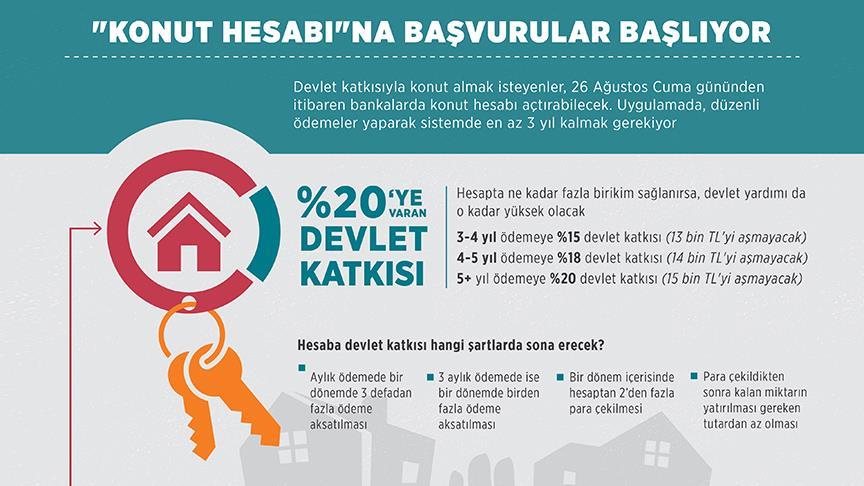 AA muhabirinin derlediği bilgilere göre, konut hesabı uygulamasıyla vatandaşların konut satın almaları için oluşturdukları birikimlerine yüzde 20'ye varan oranda devlet katkısı sağlanacak. Söz konusu katkı 15 bin lirayı geçemeyecek. Türk lirasına kadar devlet katkısı sağlanacak.