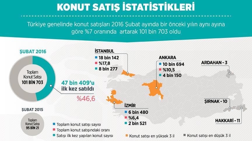 Türkiye İstatistik Kurumu (TÜİK) bu yılın şubat ayına ilişkin konut satış istatistiklerini açıkladı. Buna göre, satış sonucu el değiştiren konut sayısı, şubatta geçen yılın aynı ayına göre yüzde 7 artışla 101 bin 703 olarak gerçekleşti. Konut satışlarında İstanbul 18 bin 142 ile en yüksek paya (yüzde 17,8) sahip oldu.