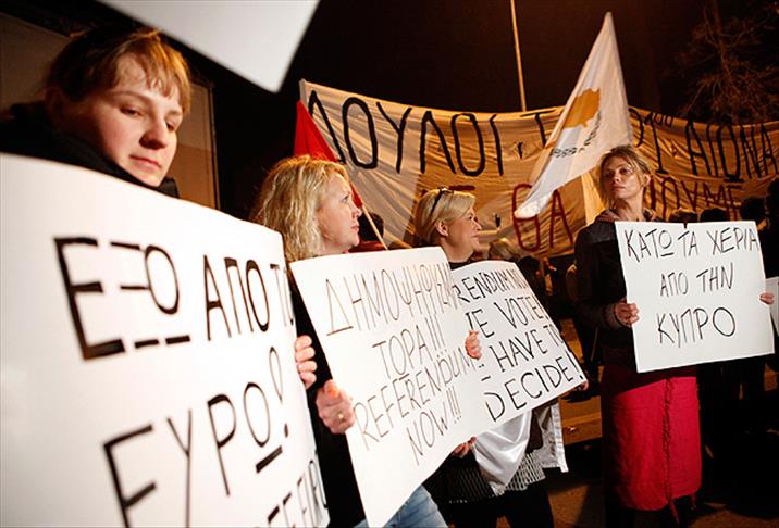 Komünist Parti AKEL'in çağrısı üzerine akşam saatlerinde Rum Parlamentosu önünde toplanan yaklaşık bin kişi, AB bürolarının bulunduğu ''European Union House'' binasına kadar yürüdü.