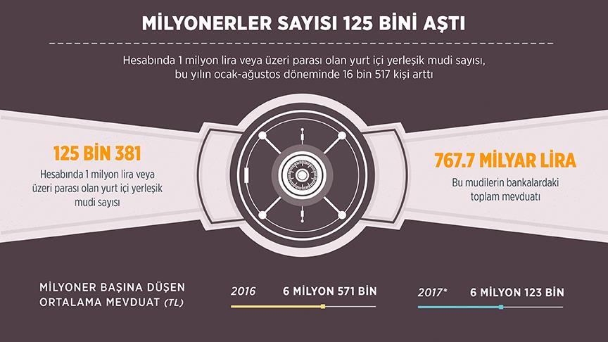 BDDK verilerine göre, milyonerlerin sayısı bu yılın ağustos sonu itibarıyla 2016 sonuna kıyasla 16 bin 517 kişi artarak 125 bin 381'e ulaşırken, toplam mevduatları da 767 milyar 721 milyon lira oldu.