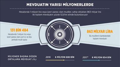 Toplam mudilerin içinde, hesabında 10 bin liraya kadar mevduat bulunan kişi ve kuruluşların sayısı 53 milyon 20 bin 228 olarak belirlenirken, 1 milyon lira ve üzerinde paraya sahip yurt içi yerleşik mevduat sahibi sayısı geçen yılın ocak-haziran dönemine göre yaklaşık yüzde 15 artarak 56 bin 417'ye çıktı. Böylece geçen yılın ilk 6 ayına kıyasla milyoner sayısına 7 bin 447 kişi daha eklenmiş oldu. Anılan dönemde gerçek kişilerin hesaplarındaki mevduat tutarı da yine yüzde 15 artarak 66,3 milyar liradan 76,4 milyar liraya yükseldi.