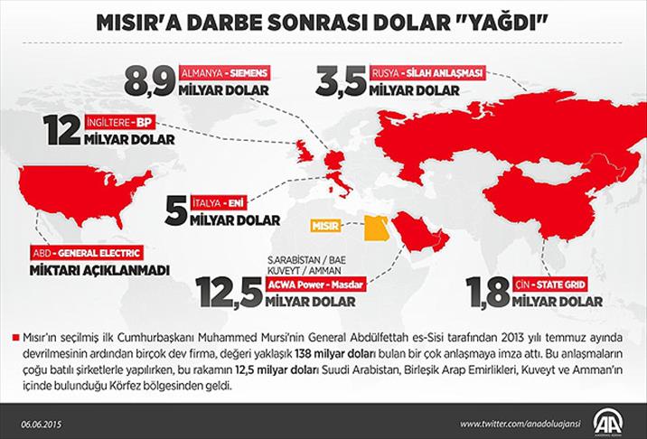 Mısır’ın seçilmiş ilk Cumhurbaşkanı Muhammed Mursi'nin Temmuz 2013'te darbeyle görevinden uzaklaştırılmasının ardından, "darbeye tepki" için gözlerin çevrildiği Batı ülkelerinden, beklenen tepkiler gelmezken, Mısır'a ekonomik anlamda destek yağdı.