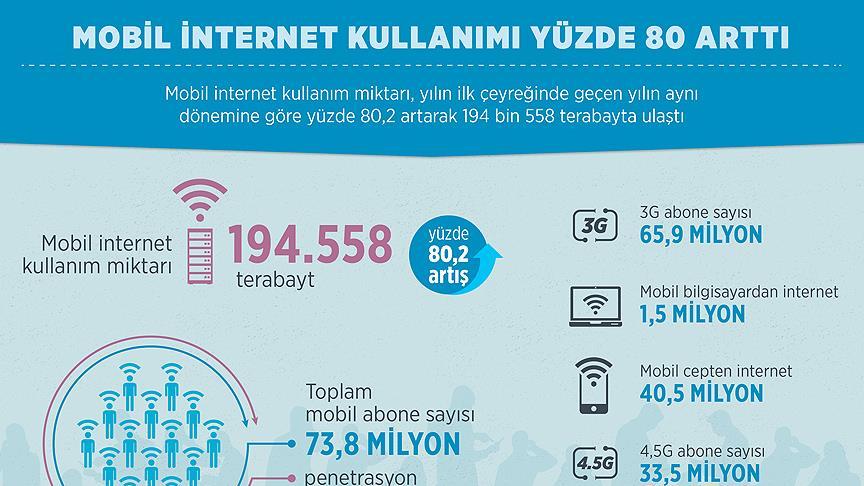 Mobil internet kullanım miktarı, yılın ilk çeyreğinde geçen yılın aynı dönemine göre yüzde 80,2 artarak 194 bin 558 terabayta ulaştı.