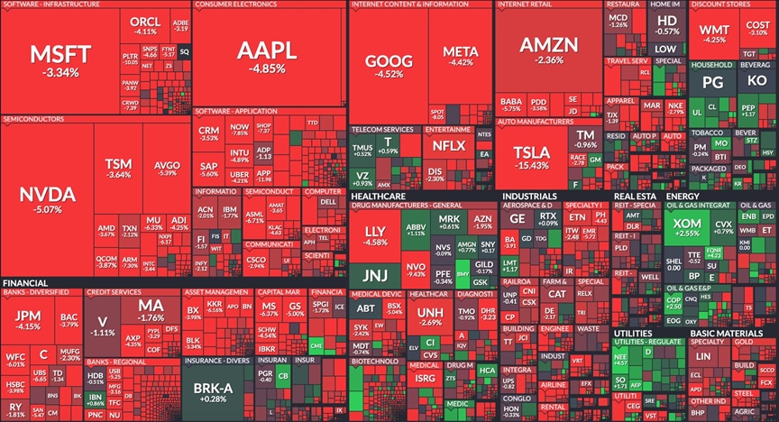 S&P 500 endeksi yüzde 2,75 azalışla 5.611,71 puana inerken, Nasdaq endeksi yüzde 4 kayıpla 17.468,32 puana düşerek 2022'den bu yana en kötü gününü yaşadı.