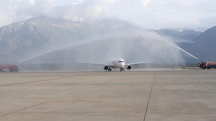Uçak, aprona girerken Erzincan-İzmir seferlerinin başlaması dolayısıyla iki itfaiye aracının püskürttüğü suyun altından geçti.