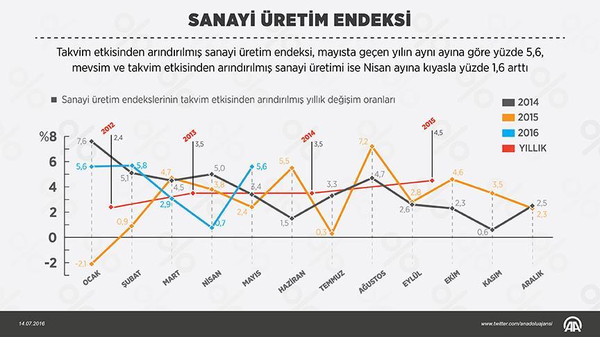 Takvim etkisinden arındırılmış sanayi üretim endeksi, mayısta geçen yılın aynı ayına göre yüzde 5,6, mevsim ve takvim etkisinden arındırılmış sanayi üretimi ise Nisan ayına kıyasla yüzde 1,6 arttı.