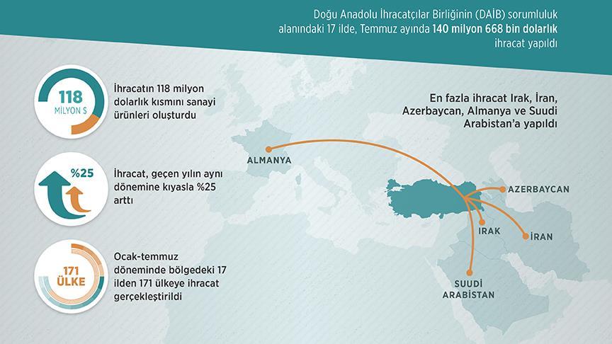 Doğu Anadolu İhracatçılar Birliğinin (DAİB) sorumluluk alanındaki 17 ilde, temmuz ayında 140 milyon 668 bin dolarlık ihracat yapıldı.