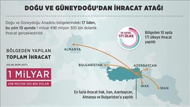 AA muhabirinin DAİB verilerinden yaptığı derlemeye göre, bu yılın ocak-temmuz döneminde, DAİB'in Doğu Anadolu ve Güneydoğu Anadolu bölgelerindeki sorumluluk alanında yer alan 17 ilden 171 ülkeye ihracat gerçekleştirildi.