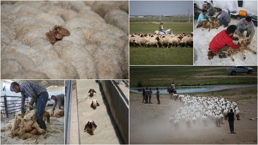 Türkiye'nin en büyük işletmeleri arasında yer alan Tarım ve Orman Bakanlığı Tarım İşletmeleri Genel Müdürlüğüne (TİGEM) bağlı Şanlıurfa'daki Ceylanpınar Tarım İşletmesinde özenle yetiştirilen ivesi koyunları, sıcak havadan etkilenmemeleri ve daha iyi gelişmeleri için yünleri kırkıldıktan sonra ilaçlı suda yıkanarak meraya çıkarılıyor.