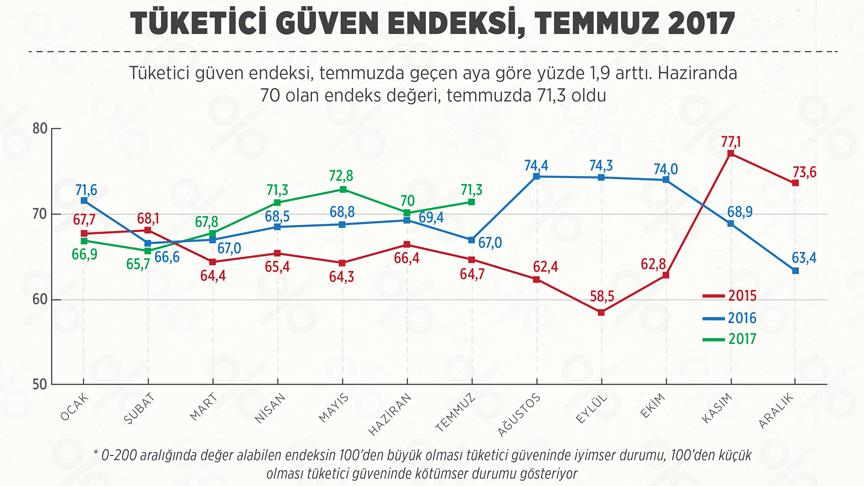 TÜİK ve Türkiye Cumhuriyet Merkez Bankası iş birliğiyle yürütülen anket sonuçlarından hesaplanan tüketici güven endeksi, temmuzda geçen aya göre yüzde 1,9 artış kaydetti. Buna göre haziranda 70 olan endeks değeri temmuzda 71,3 olarak kayıtlara yansıdı.
