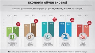 Türkiye İstatistik Kurumu (TÜİK), Merkez Bankası işbirliğiyle yürütülen Tüketici Güven Endeksi'ni yayımladı. Buna göre, Tüketici Güven Endeksi Mart ayında geçen aya göre yüzde 2,3 azaldı. Şubat ayında 76,7 olan endeks, Mart ayında 74,9 değerine geriledi.