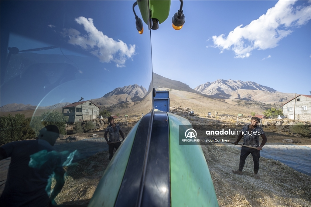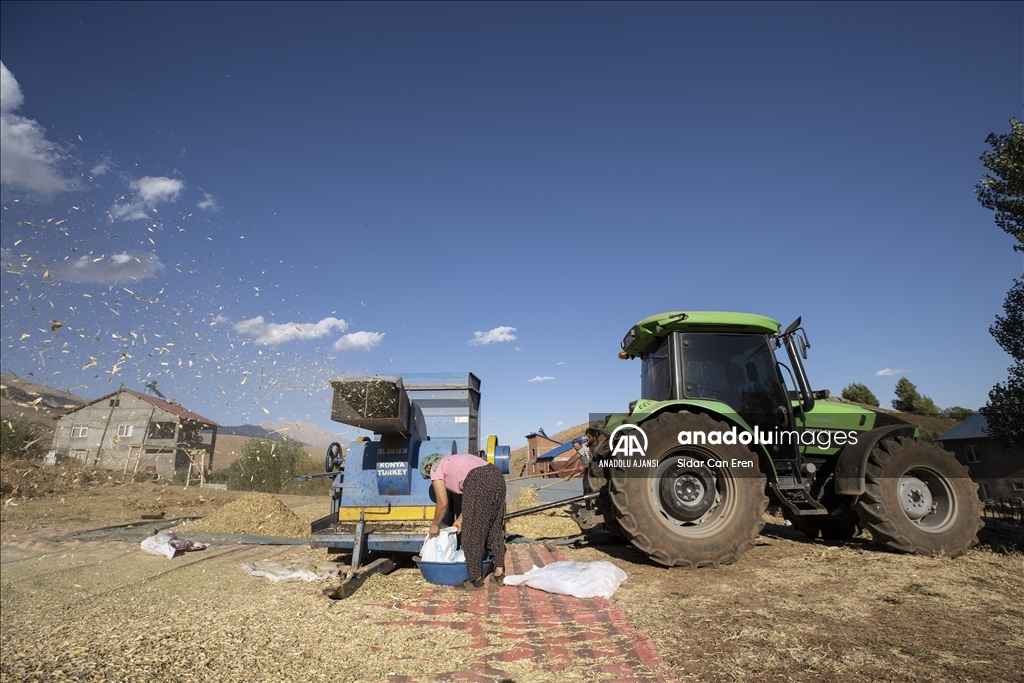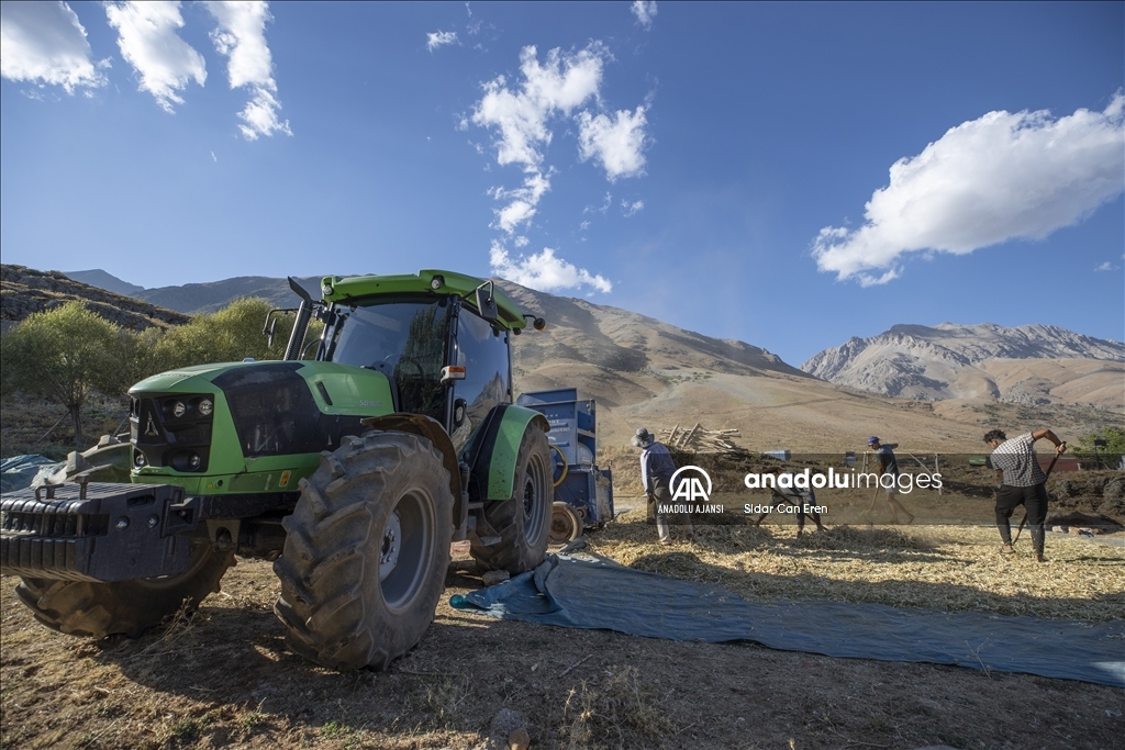 Tarlalarda birkaç gün kurumaya bırakılan fasulyeler, daha sonra köylüler tarafından traktörlerle bir araya toplanıp harman makinesine atılıyor.