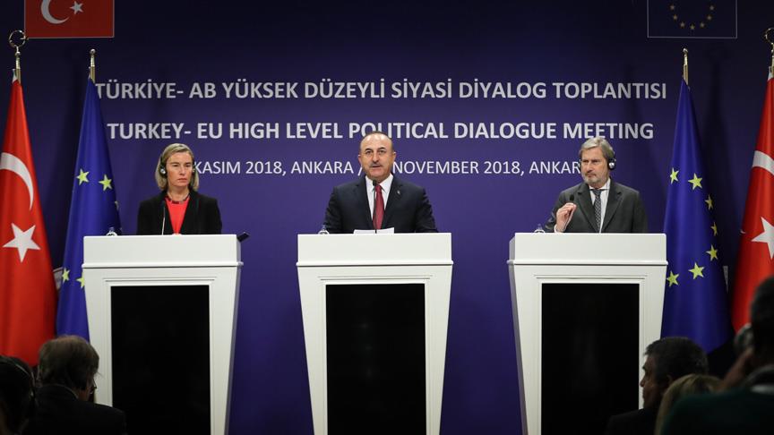 Dışişleri Bakanı Mevlüt Çavuşoğlu, Avrupa Birliği (AB) Dış Politika Yüksek Temsilcisi Federica Mogherini ve Komşuluk Politikaları ve Genişleme Müzakerelerinden Sorumlu Komisyon Üyesi Johannes Hahn, Ankara'da yaptıkları Türkiye-AB Yüksek Düzeyli Siyasi Diyalog toplantısının ardından ortak bir açıklama yaptı.