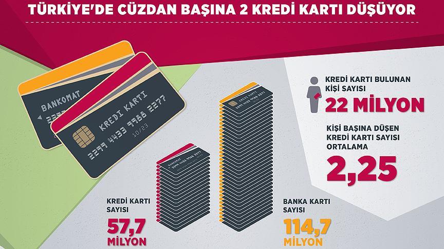AA muhabirinin Bankalararası Kart Merkezinin (BKM) eylül ayı verilerinden derlediği bilgilere göre, Türkiye'de 57,7 milyon kredi kartı ve 114,7 milyon da banka kartı olmak üzere 172,4 milyon adet kart kullanılıyor. Kredi kartı sayısı, bu yılın eylül ayında geçen yılın aynı dönemine kıyasla değişmezken, banka kartı sayısında yüzde 1'in üzerinde artış kaydedildi.
