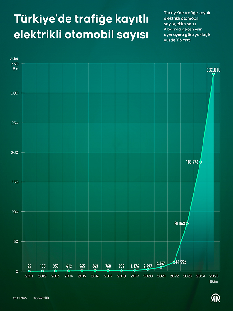 Türkiye'de trafiğe kayıtlı elektrikli otomobil sayısı, ekim sonu itibarıyla geçen yılın aynı ayına göre yaklaşık yüzde 116 artarak 332 bin 10'a yükseldi.