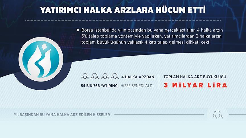 Borsa İstanbul'da 2017'de sessiz geçen halka arz piyasası, bu yıla hızlı başladı. Yılbaşından bu yana gerçekleştirilen 4 halka arzdan biri Borsa İstanbul Birincil Piyasa'da satış, 3'ü de fiyat aralığı ile talep toplama yöntemiyle gerçekleştirildi. Yatırımcılardan, talep toplama yöntemiyle arz edilen 3 halka arzın toplam büyüklüğünün yaklaşık 4 katı talep gelmesi dikkati çekti.