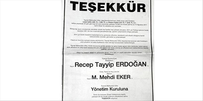 Trabzon'daki 17 ziraat odası, depolarında yer alan fındığı piyasaya sürmeyerek yeni sezon öncesi fındık fiyatının düşmesini önleyen önleyen Toprak Mahsulleri Ofisi (TMO) ile ofise güç ve talimat vererek süreci destekleyen Başbakan Recep Tayyip Erdoğan'a, gazetelere tam sayfa ilan vererek teşekkür etti.