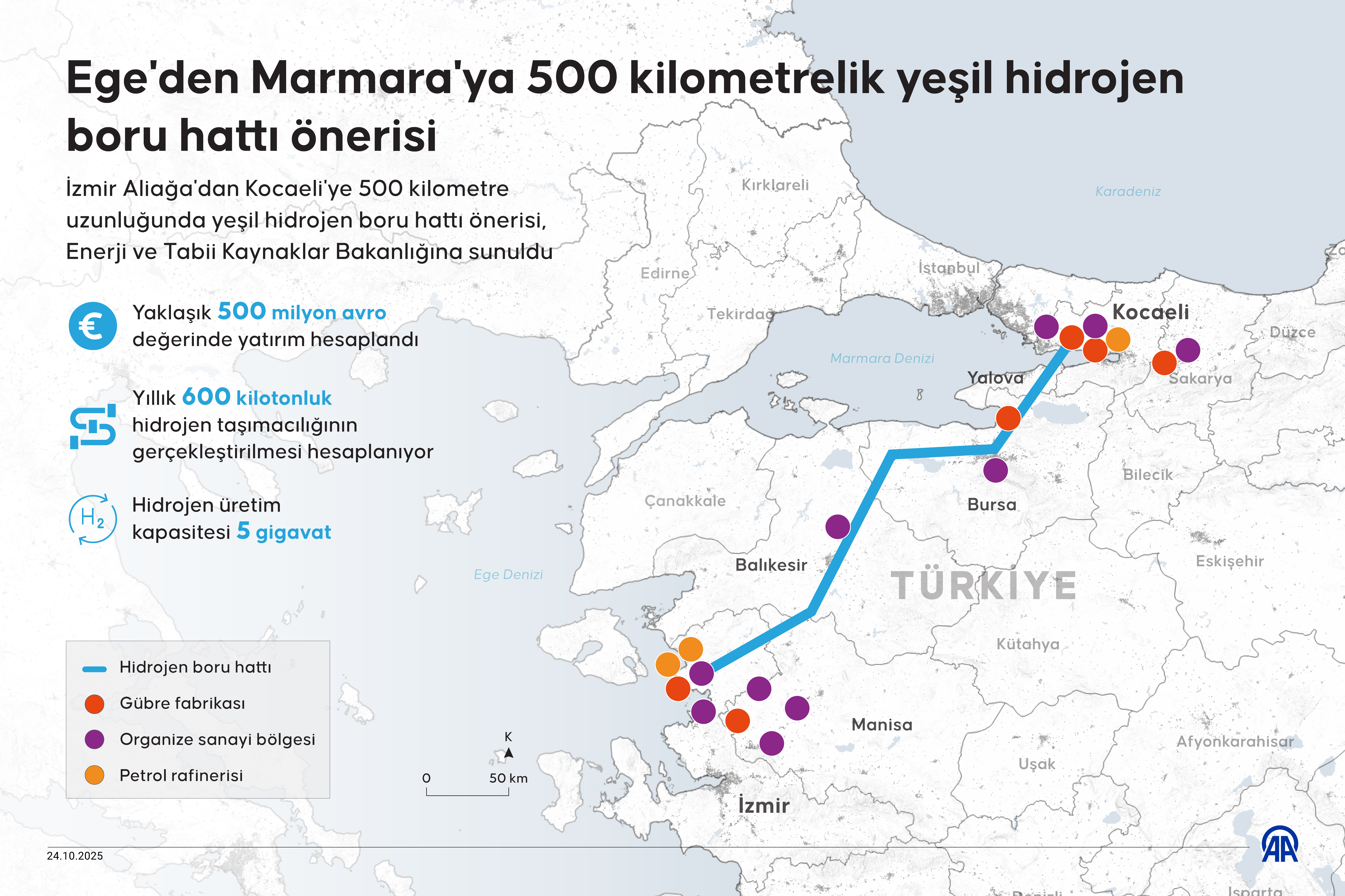 Yeşil Hidrojen Üreticileri Derneği (H2DER) Başkan Yardımcısı Murat Aşçı, İzmir Aliağa'dan Kocaeli'ye 500 kilometre uzunluğunda yeşil hidrojen boru hattı önerisinin Enerji ve Tabii Kaynaklar Bakanlığına sunulduğunu bildirdi.