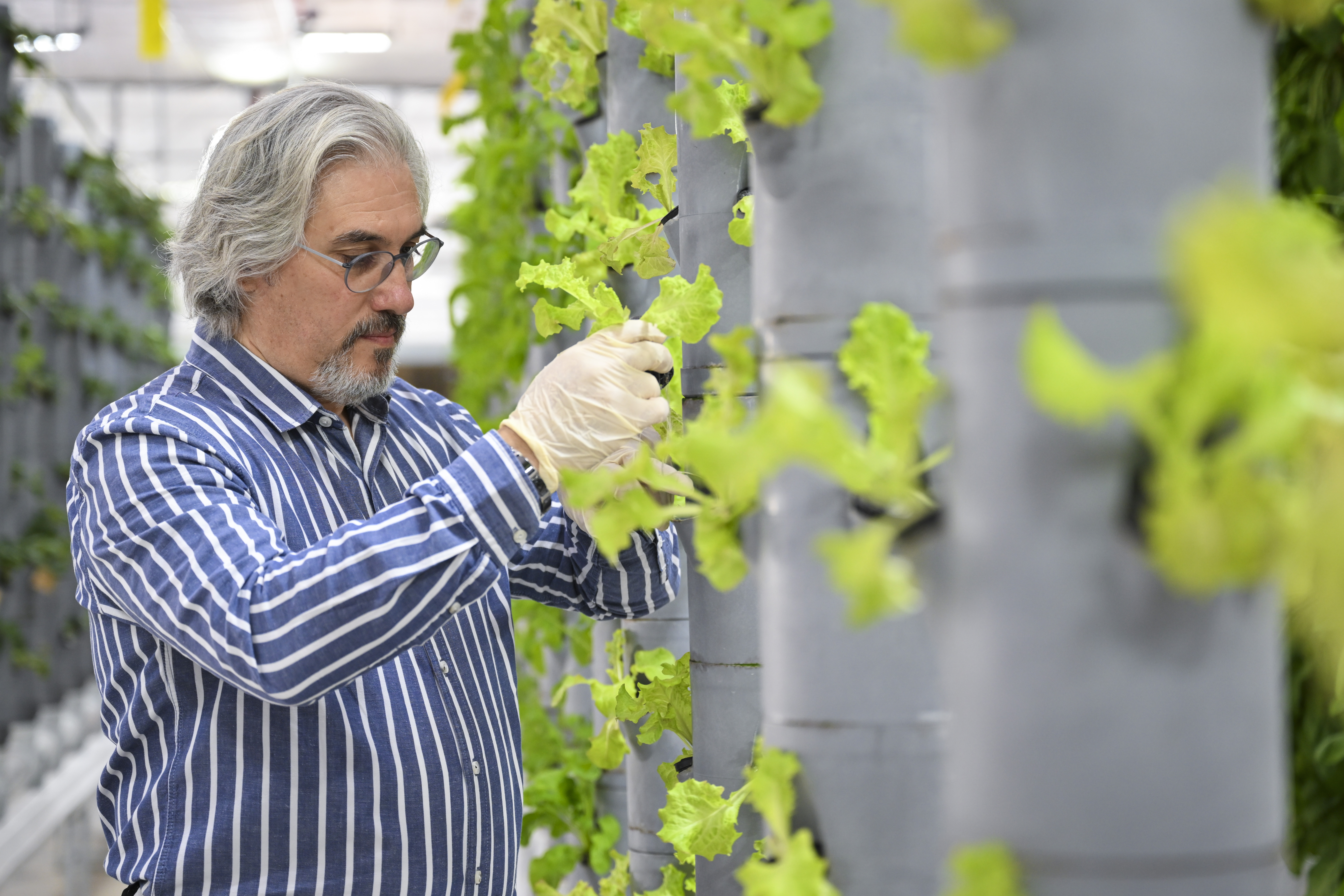 "Bu tesiste AR-GE kule dizilimi bulunuyor. Bu haliyle yaklaşık olarak 1500 bitkiye kadar çıkabiliyoruz. 40 metrekarelik bir alan düşünürsek oldukça verimli. Dikey yetiştiricilik dünyada uzun yıllardır uygulanan Türkiye'de belli yerlerde denenen bir sistem. Genel olarak yurt dışından malzemelerin temin edilmesi nedeni ile ilk kurulum maliyetleri yüksek olduğu için çok fazla uygulanan bir üretim çeşidi değil. Burada topraksız üretim yapılıyor, genellikle dikey tarım sistemlerinde ve topraksız tarımın da ana unsuru köklerin açık bir şekilde bulunması, su ve gübre karışımının da doğal olarak doğrudan köke gelip minimum su, minimum gübre tüketimi, aynı zamanda minimum enerji sarfiyatıyla bitkinin yetişmesi sağlanıyor."