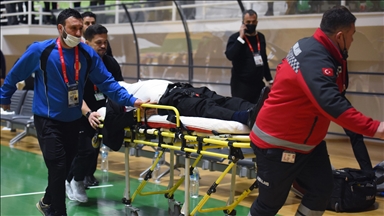 Halil Akbunar ile girdiği mücadele sonrasında acı içinde yerde kalan Mahmut, sedye ile saha kenarına alındı.