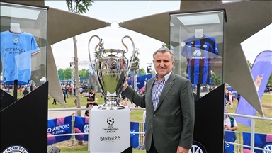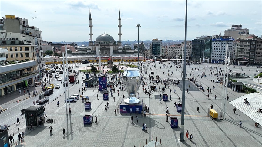 UEFA Şampiyonlar Ligi finali öncesinde, Şampiyonlar Ligi kupasının dev maketi ve büyük bir futbol topu, Taksim Meydanı'na konuldu. Yerli ve yabancı turistler, meydanda sergilenen dev kupa ve futbol topunun önünde hatıra fotoğrafı çektiriyor.